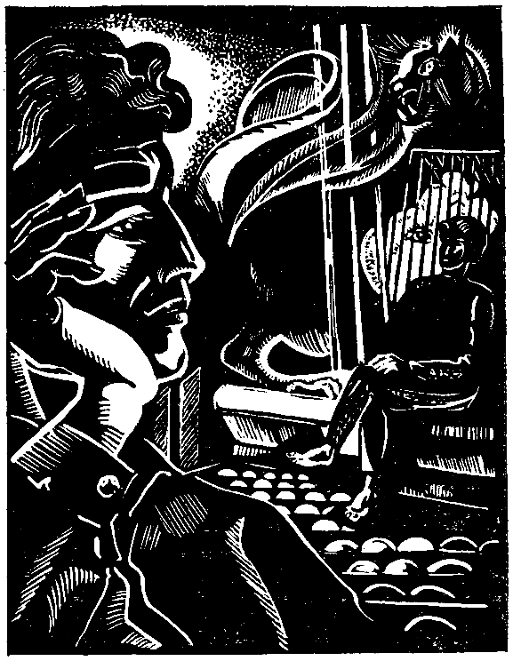 Странный скрип и скрежет привлекли внимание Гирина. Он поднял глаза и насторожился: у самых серебристых прутьев клетки стоял Голем во всей своей чудовищной красе, широко расставив свои могучие ноги-колонны, и потряхивал расслабленными руками примерно так, как это делают тяжелоатлеты, прежде чем нагнуться к штанге с рекордным весом. Голем глубоко вздохнул, его бочкообразная грудь при этом раздулась как резиновая, положил тяжёлые кисти рук на прутья решётки, пошевелил пальцами, ухватываясь ими поудобнее, и напрягся. Буграми вздулись чудовищные мускулы, раздался скрип и скрежет. Короткие, но тягучие мгновения между серебристым металлом и мышцами титана-разрушителя шло молчаливое яростное состязание. Прутья, один вправо, другой влево, выгибались все более крутой дугой, натягивались, точно тетивы чудовищных луков… И наконец со звоном лопнули! Голем с шумом выдохнул воздух, постоял, потряхивая руками, опущенными вдоль тела, а потом с видимым усилием, но без первоначального крайнего напряжения сил аккуратно отогнул концы разорванных прутьев Кверху и книзу, образовав таким образом в решётчатой стене своей клетки достаточно широкий проход. Примерившись, титан не без труда протиснул в эту щель своё могучее тело и грузно спрыгнул на пол. Пока Голем потрошил свою клетку, Гирин наблюдал за его неторопливой сокрушающей работой с сочувствием и восхищением. Это чувство было сродни тому, которое испытывает обыкновенный человек, наблюдая за выступлением цирковых силачей. Но когда Голем выбрался в коридор и принялся лениво-замедленно, точно при демонстрации рапидной съёмки, оглядываться по сторонам, Гирин ощутил тревогу. Куда пойдёт этот титан? Какое примет решение? Для чего использует свою мощь, казавшуюся со стороны беспредельной? Словно уловив тревогу, мелькнувшую в сознании Гирина, Голем повернулся всем корпусом и зашагал к клетке Александра. Он шёл медленно, тяжело, но пластично, в его движениях была своеобразная тягучая непринуждённость, слоновья грация. Голем подошёл к клетке Гирина вплотную, Александр попятился назад и упёрся спиной в заднюю стенку клетки. Сердце у него колотилось, мысль металась в поисках выхода перед надвигающейся, неотвратимой, словно сама судьба, опасностью и не находила его! Помаргивая глазами-щелями, Голем некоторое время наблюдал за Гириным, а затем глубоко вздохнул, неправдоподобно широко раздувая свою бочкообразную грудь, и уверенно положил тяжёлые кисти могучих рук на серебристые прутья решётки. Наперёд зная, что произойдёт дальше, Александр вжался в стенку с такой силой, что заболела спина, точно надеялся, что стенка может податься и пропустить его. Расширенными глазами он машинально следил за тем, как легонько пошевелились толстые пальцы с грубыми восковидными ногтями, поудобнее ухватываясь за скользкий металл. Почти физически Гирин ощутил, какой неимоверной силой наливается каждая жила, каждый, словно свитый из стали, мускул могучего тела. Будто морозный ветер пахнул на него, заставив больно сжаться сердце. - Пошёл! А ну пошёл отсюда! - крикнул Александр, как обычно покрикивают хозяева на расшалившуюся собаку, но в его голосе прозвучала не уверенность, а безнадёжность. - Руха! - торжествующе ответил Голем, и в прорезях его глаз сверкнула зелёная молния. - Гаха! Чудовищные мускулы напряглись, вздув