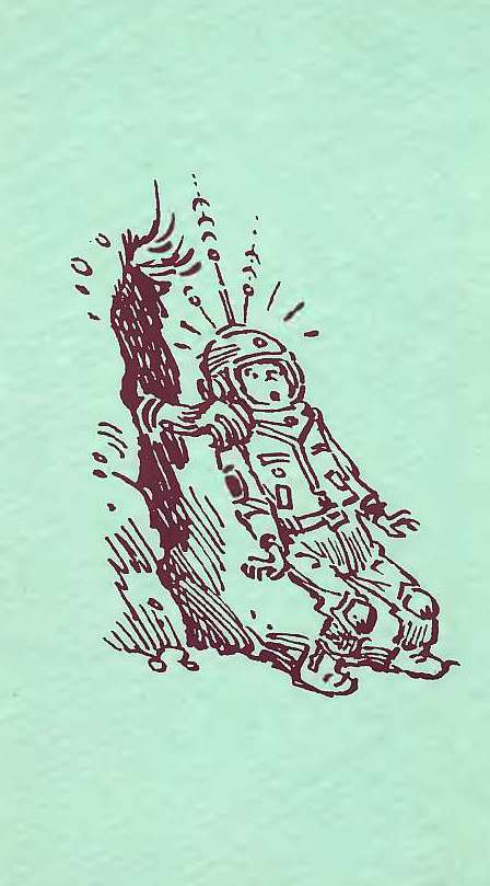 Все были увлечены находками, и Алиса рассудила, что в ее распоряжении, по крайней мере, часа два до обеда. Она сунула за пояс бластер, проверила, лежат ли в кармане скафандра очки ночного видения, и отправилась в недалекий, но рискованный поход. Перейдя реку, Алиса остановилась, глядя вверх, на вход в пещеру. До него было метров десять, и обрыв был крутым, почти отвесным. На полпути к пещере начинались колючие кусты. Значит, метров пять придется подниматься, цепляясь за небольшие выступы и прижимаясь к камням. Алиса оглянулась. Вроде бы никакой опасности. Она глазами отыскала несколько выступов в стене и поставила ногу на первый. Первые метра три она поднималась уверенно, но тут везение прекратилось. Ни одного выступа, ни одной трещины. Только остролистый кустик в метре над головой. Алиса попыталась выцарапать углубление в твердой скале, но перчатки были слишком мягкими для этого, а ничего более твердого она взять с собой не догадалась. «Наверное, придется спускаться и искать другой путь», — подумала она, хоть спускаться было жаль — до кустиков осталось совсем немного. Тогда она вспомнила о бластере. Осторожно, чтобы не потерять равновесия, Алиса достала бластер из-за пояса. Конечно, луч его рассчитан только на то, чтобы усыпить жертву. И все же… Прижавшись к скале, Алиса отвела в сторону руку с бластером и нажала на курок. Ослепительный луч коснулся скалы, подняв облачко пыли. Нет, ничего не выходит. Алиса перевела силу бластера на максимум. И тут почувствовала опасность. Она ничего не видела, не слышала — просто поняла, что внизу — враг. Одного взгляда было достаточно, чтобы убедиться — она не ошиблась: у подножия обрыва стояло чудовище, похожее на крокодила, только на высоких лапах, и раздумывало, как ему сожрать Алису. Если бы чудовище сообразило встать на задние лапы, оно могло бы без труда уцепиться Алисе за ногу и стащить ее вниз. Алиса же ничем помешать чудовищу не могла, потому что с трудом балансировала на носках, распластавшись по стене. Заметив, как Алиса старается оторвать руку с бластером от скалы, чудовище сжалось на мгновение и, распрямившись пружиной, прыгнуло! Этот прыжок и разрешил все Алисины трудности. От испуга она взлетела вверх и вцепилась в кусты, росшие под входом в пещеру. Откуда взялись на это силы, она сама не поняла. Чудовище, оскорбленно рыча, сползло на брюхе к подножию обрыва, а Алиса подтянулась, держась за кусты. Через несколько секунд она уже была в пещере. С минуту Алиса неподвижно лежала у входа в пещеру, прислушиваясь, есть ли там кто-нибудь. Но вокруг было совершенно тихо.